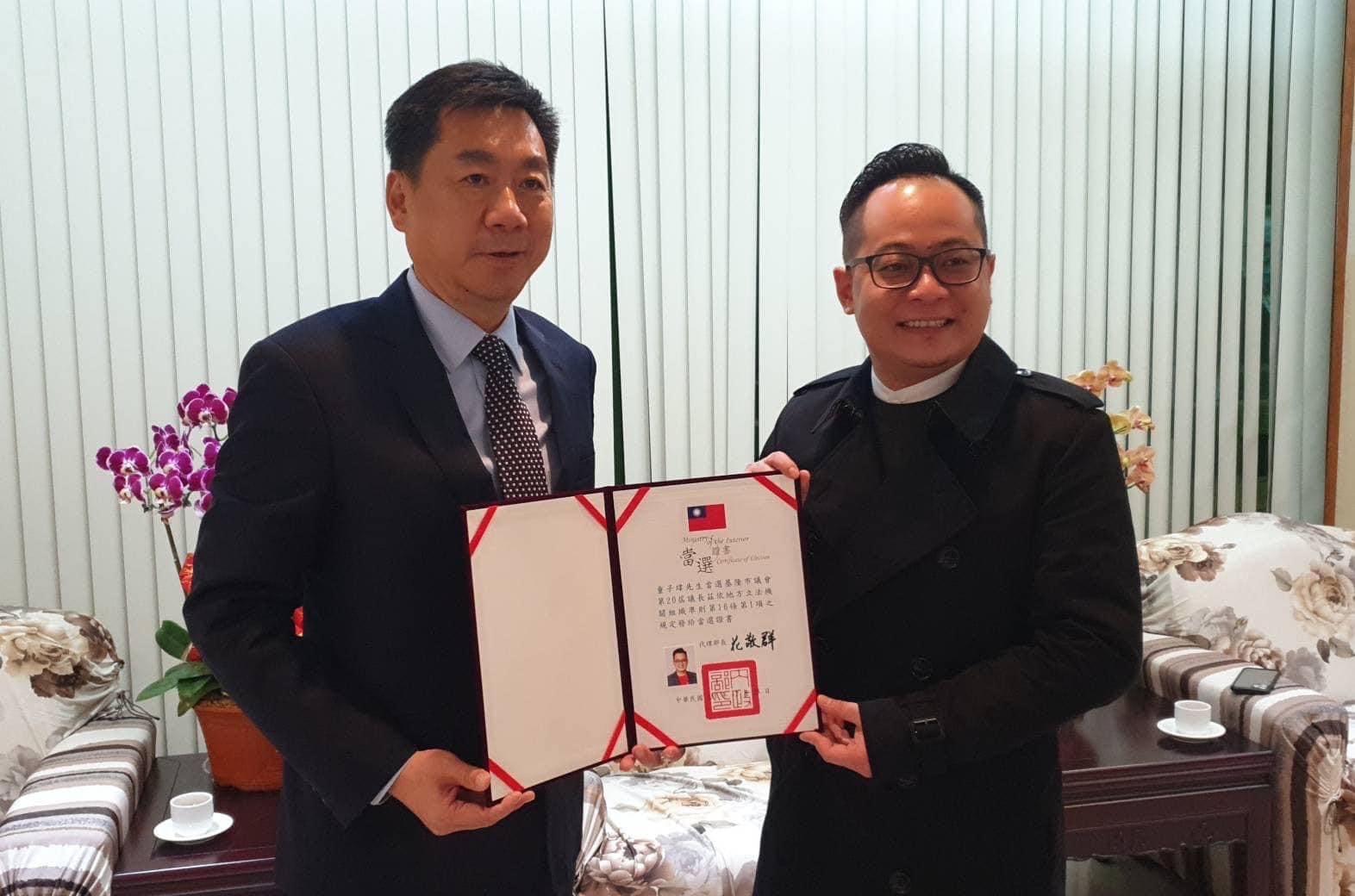 內政部 陳宗彥 次長1月17日來訪基隆市議會,向第二十屆基隆市議會議長當選人童子瑋與副議長當選人 楊秀玉 頒發當選證書。