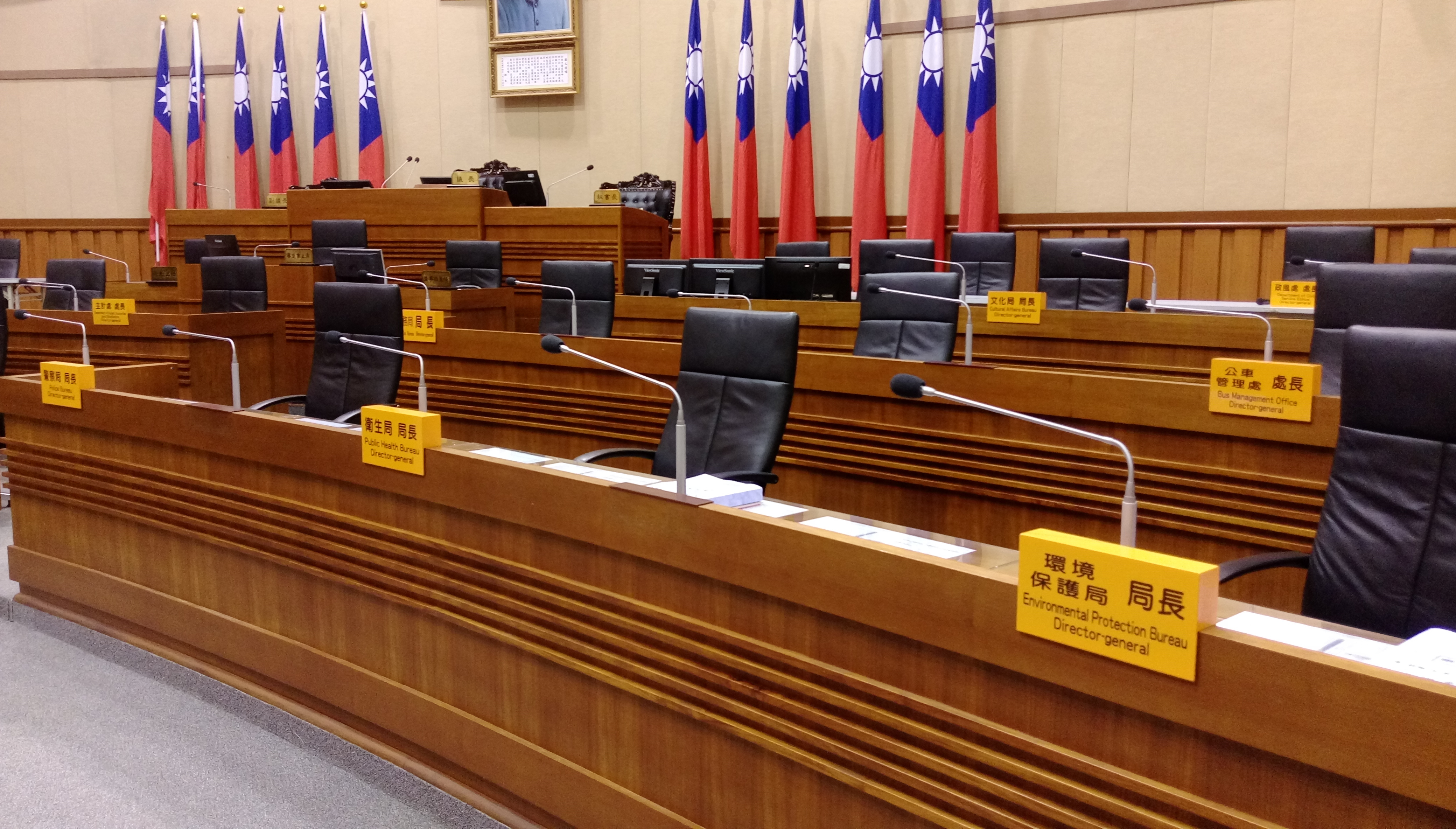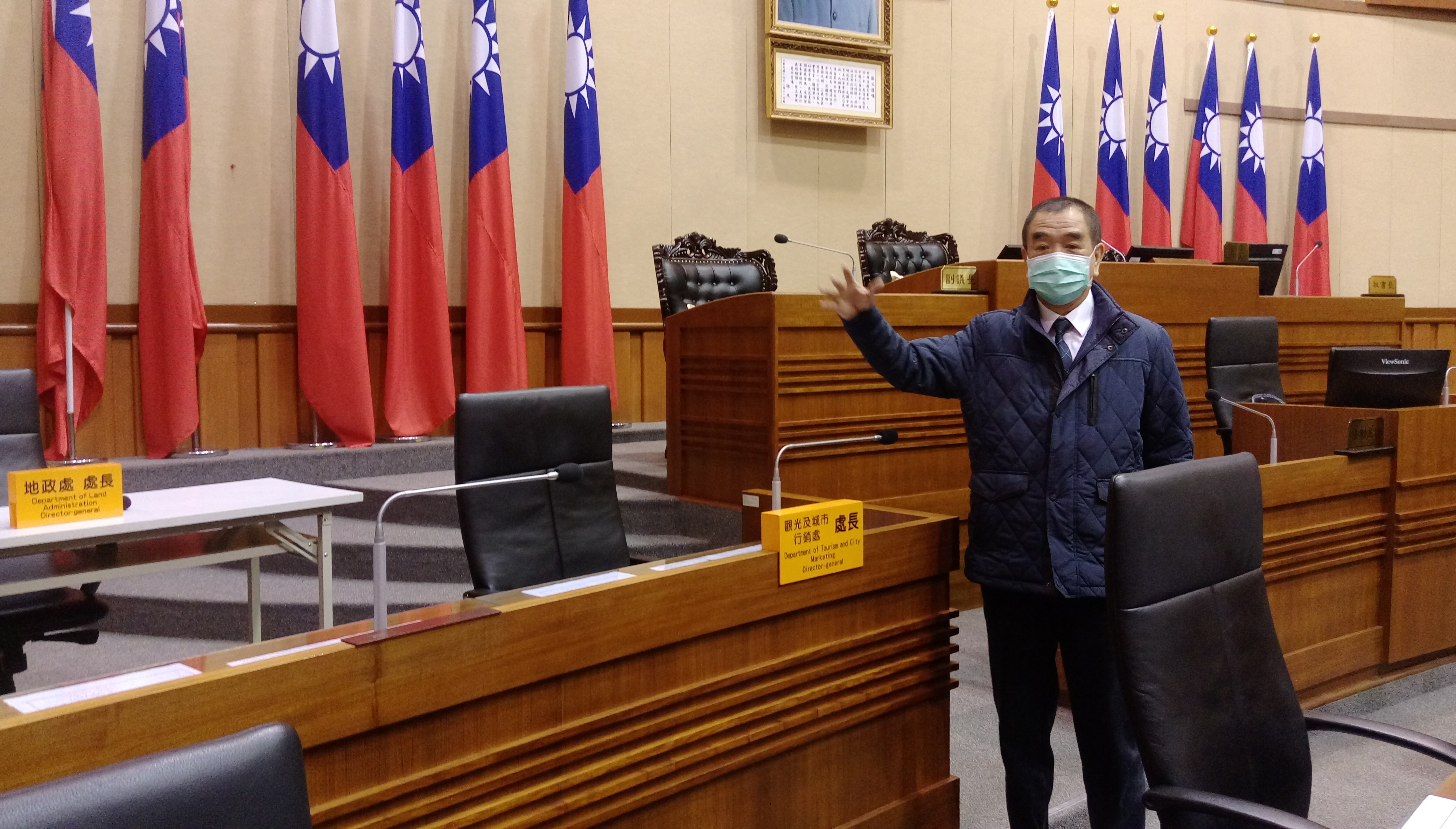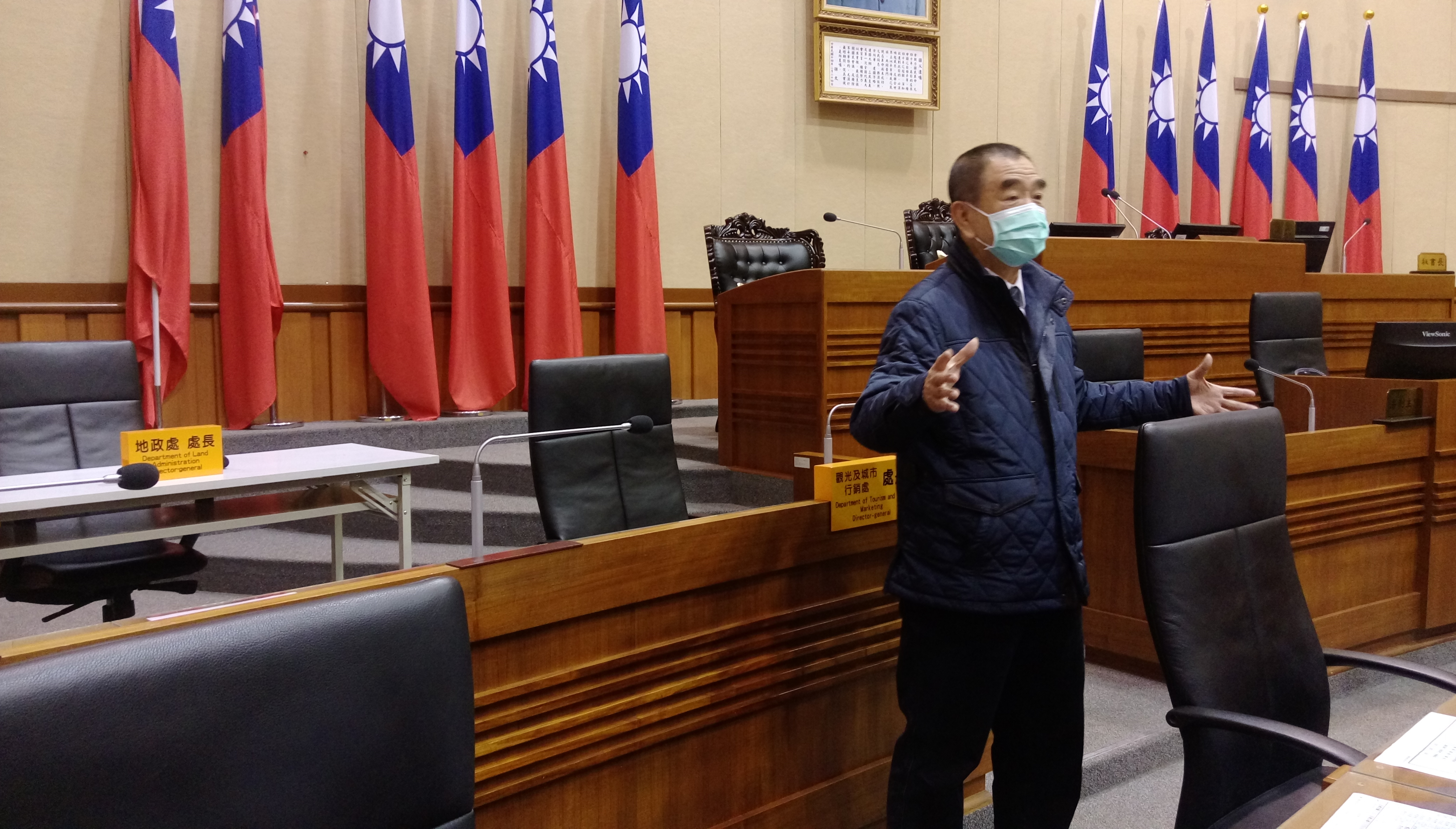因應本會第19屆第三次定期大會即將召開,為維護議會同仁及列席市府官員健康、安全與議事順暢,議事廳列席官員座位也已經做好調整,左、右之間有二公尺的距離完全符合防疫規定;蔡旺璉議長說,議會內部自4月7日起即超前部署採取分流上班的措施,例如議長室人員區隔兩個辦公室上班、議事組人員分開在兩個辦公室上班、總務組人員分為五個辦公室上班等,每個辦公室最少2人、最多6人以維持安全距離,並在每個星期定期召開防疫檢討會議,完善相關防疫措施以確保「防疫零漏洞」!大家攜手同心一起戰勝疫情!