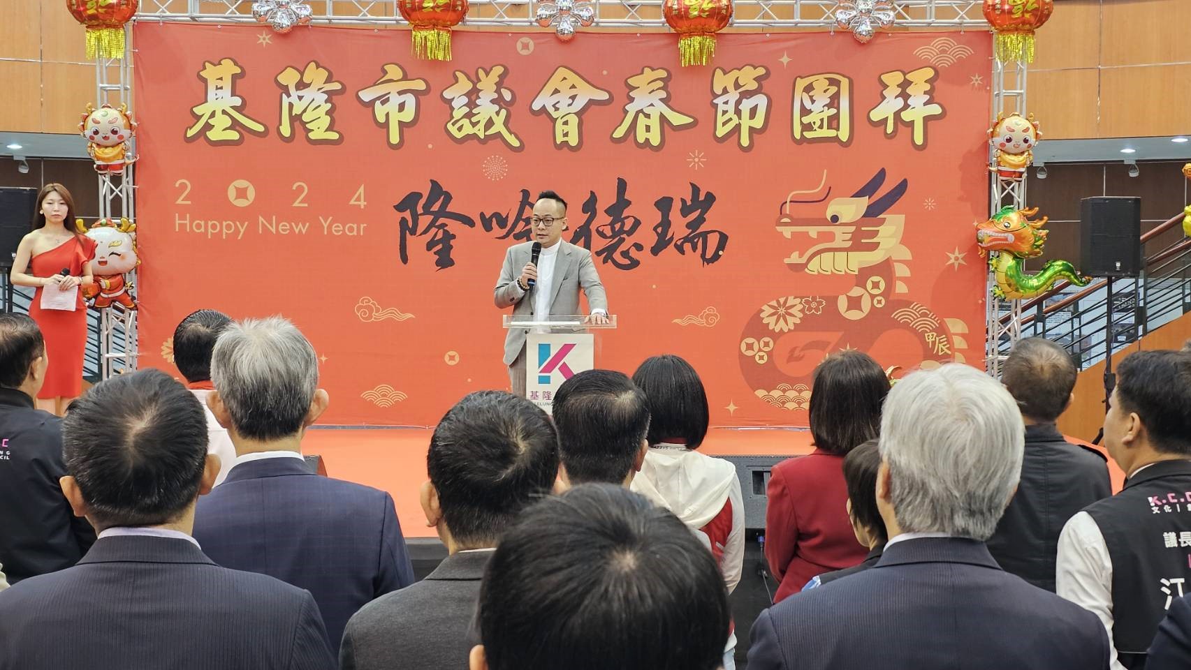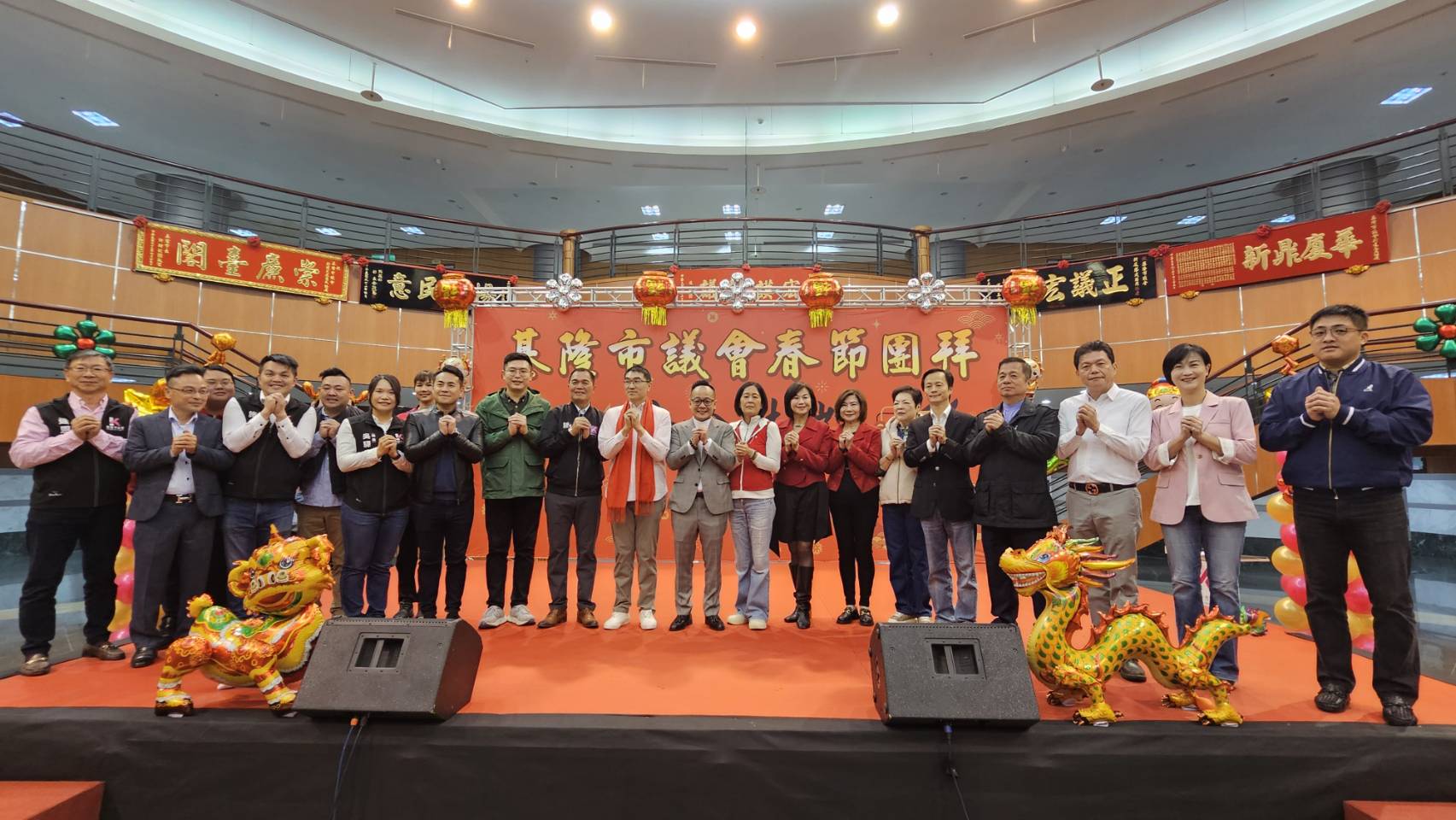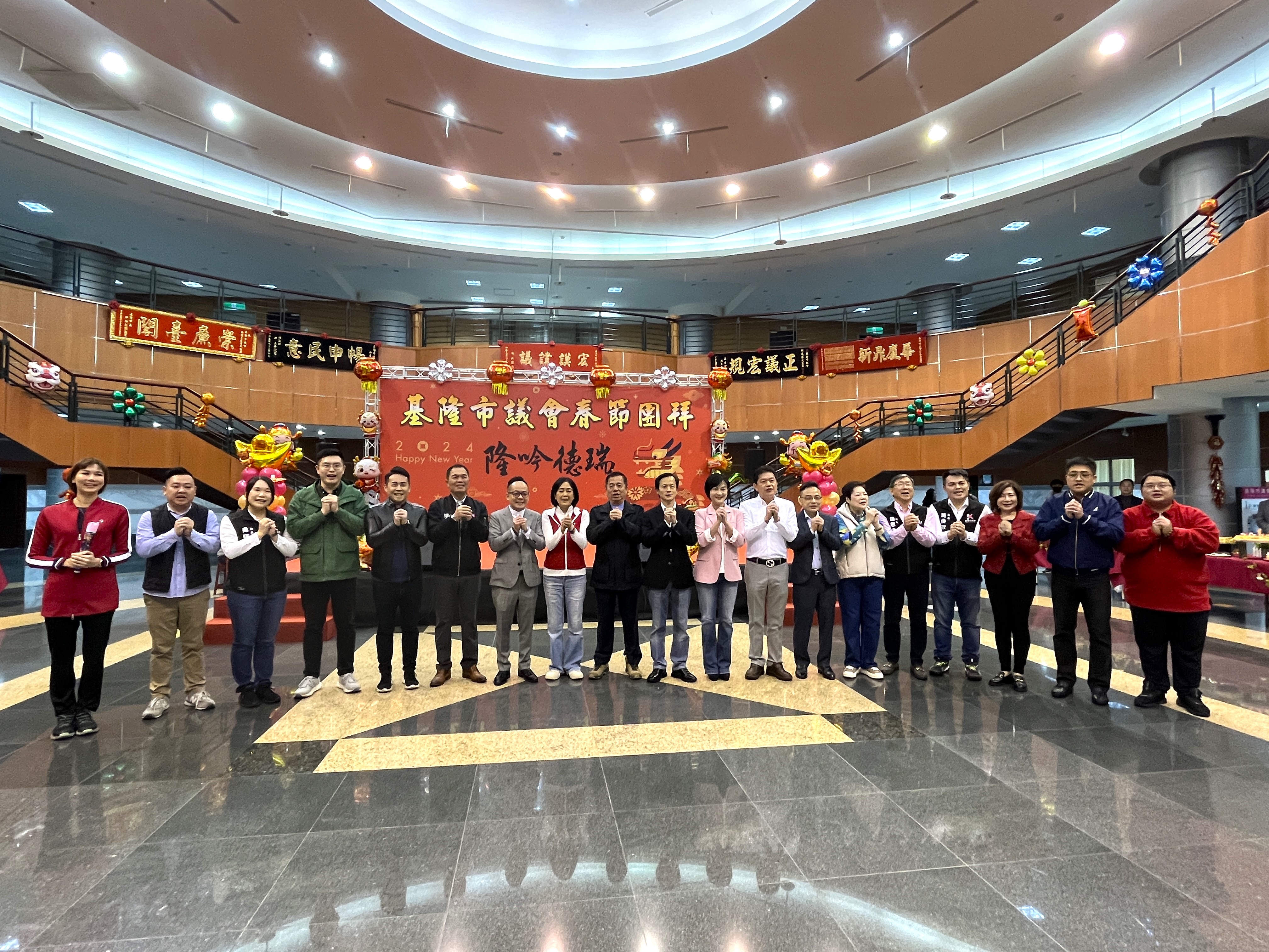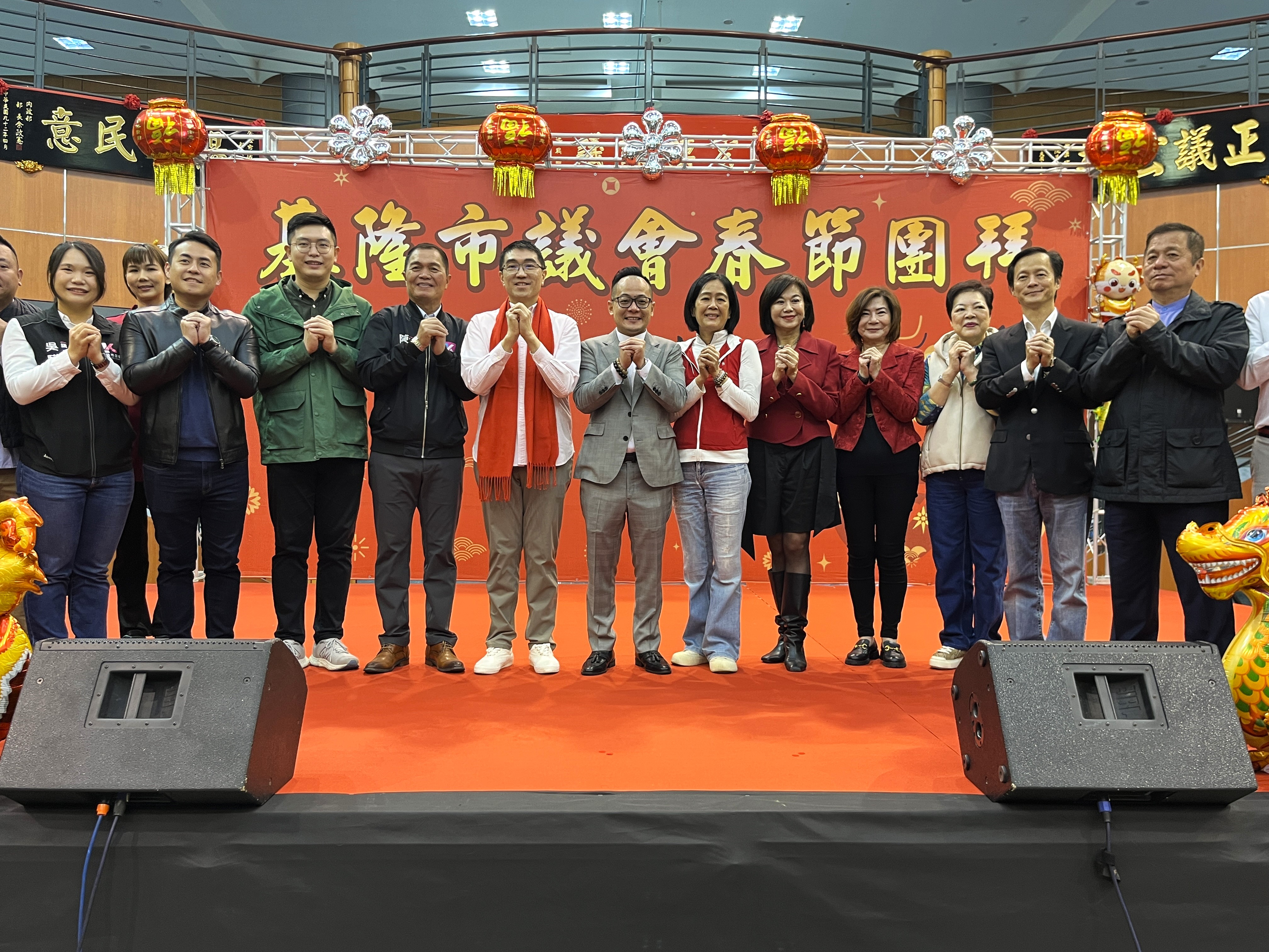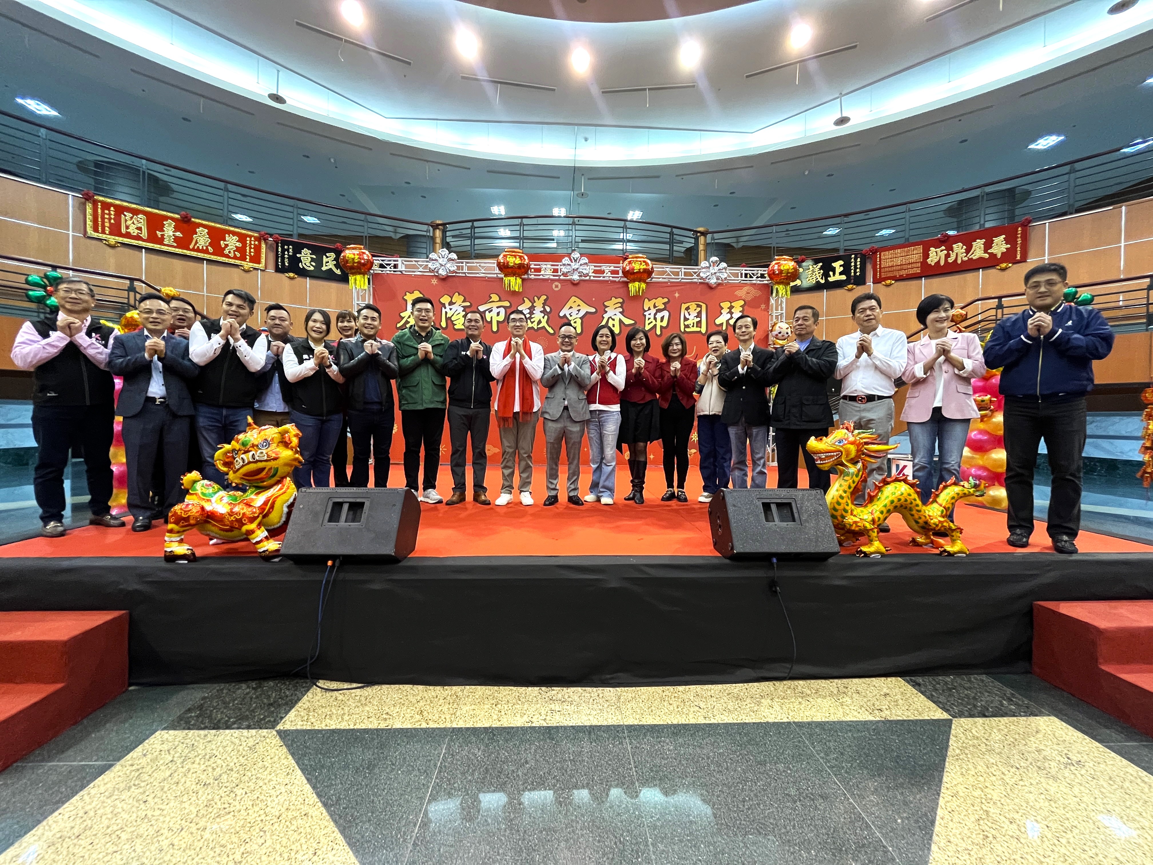 市議會1樓大廳架設大紅色的看板寫下「隆吟德瑞」另有財神爺造型等多樣氣球,格外有過年氣氛,現場主持人還教起帶動唱,議員們與市府人員齊聚一堂一起跳舞,現場好不熱鬧。在議長童子瑋的帶領下,30位市議員互道恭喜,童子瑋除了在現場發放紅包外,並親自前往議會各科室慰問上班同仁。童子瑋指出,在這個充滿喜悅和希望的新開始,謹代表基隆市議會,向大家致以最誠摯的新春祝福,祝福大家在新的一年裡身體健康,事業順利,也祝福故鄉基隆市運昌隆、隆吟德瑞。
