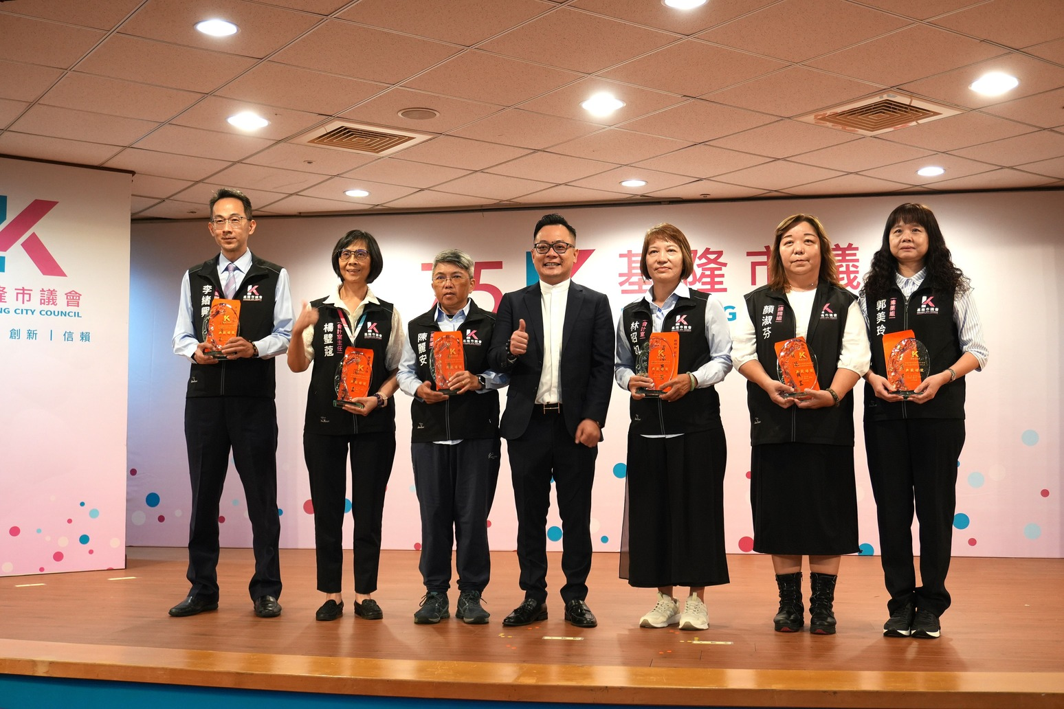 典禮首先頒發11位「資深員工」及7位「績優員工」獎牌,童議長表示這些同仁多年來默默付出、堅守崗位,不僅是議會運作的基石,更是我們能夠持續為市民服務的重要力量,藉此公開表揚機會,表達對他們感謝與敬意。